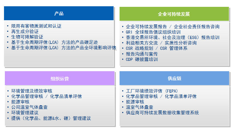 環(huán)實(shí)企業(yè)管理咨詢是一家環(huán)境及企業(yè)可持續(xù)發(fā)展咨詢公司,為香港和中國(guó)大陸上市企業(yè)和中小企業(yè)提供可持續(xù)發(fā)展服務(wù), 服務(wù)包括:企業(yè)可持續(xù)發(fā)展報(bào)告編寫、溫室氣體盤查、能源審計(jì)、產(chǎn)品生命周期分析(產(chǎn)品碳足跡)、環(huán)境審核和能力建設(shè)、紡織化學(xué)品管理審核和能力建設(shè)、職業(yè)安全EHS培訓(xùn)等等。我們的服務(wù)貫穿于客戶的整個(gè)供應(yīng)鏈,幫助企業(yè)和組織確保其產(chǎn)品和流程符合行業(yè)標(biāo)準(zhǔn)以及消費(fèi)者對(duì)安全和質(zhì)量的需求。