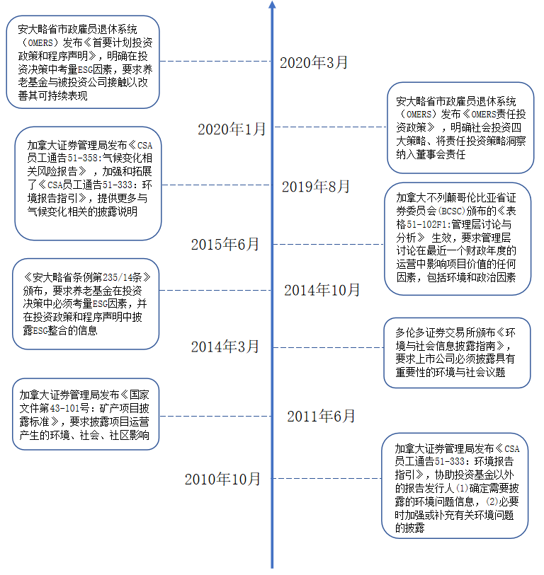 近十年來(lái),加拿大不斷研究出臺(tái)新政策和法規(guī),完善原有法律法規(guī),逐步規(guī)范和細(xì)化市場(chǎng)各參與方對(duì)ESG要素的考量及信息披露的要求,為ESG投資的發(fā)展奠定制度基礎(chǔ)。